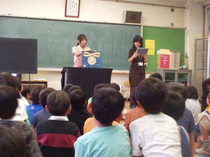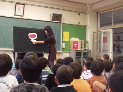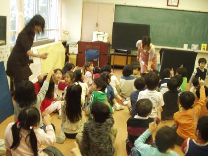 3時間目に、砧図書館の方による読み聞かせがありました。大きな絵本やパネルシアターなど、いつもとちがう本に、興味津々で聞いていました。