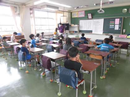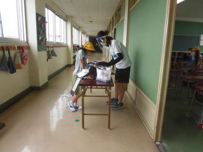 教室の前で健康カードのチェックを行い、平熱であることを確認した上で教室に入ります。