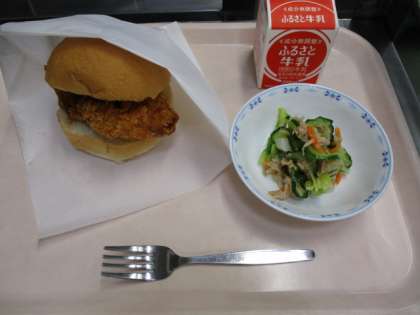 いつもならパンはお皿によそいますが、配膳しやすいように給食室でバーガー袋に入れました。