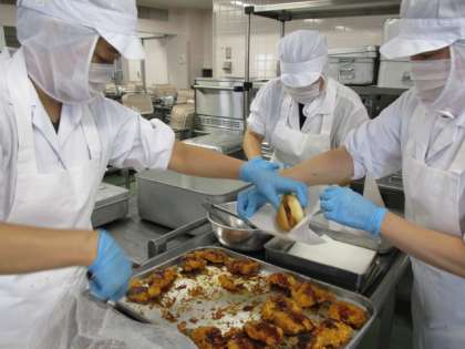 魚を揚げる人、ソースをかける人、パンにはさむ人、パンを袋に入れる人、パンを食缶に入れる人、数を確認して、運ぶ人とそれぞれ役割に分かれて衛生的に作業をしました。
