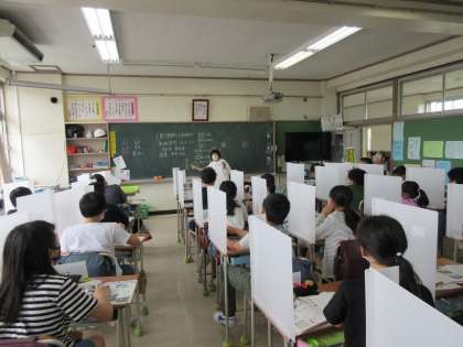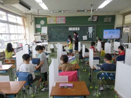 6月22日 月曜日に久しぶりに登校して来た子どもたちは、誰もが元気いっぱいでした。教室は、給食の再開を考慮し、プラスチック製の段ボールでパーテーションを机に設置しました。クラスの仲間全員とようやく顔を合わせました。