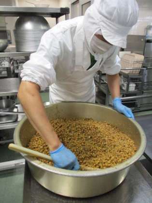 簡易給食が終わり、今日からお皿の数が増えました。1学期中は配膳時間を考慮して、品数を制限した献立となります。今日の「大豆とじゃこの甘辛揚げ」は好きな子が多く、楽しみにしていた様子でした。写真は大豆とじゃこの甘辛揚げを仕上げているところです。