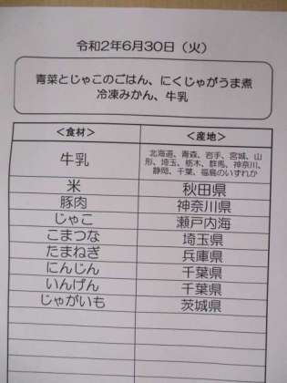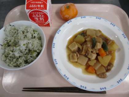青菜とじゃこのごはんは、小松菜を刻んでじゃこと一緒にごま油で炒めて塩で味付けしたものをごはんに混ぜてつくりました。カルシウムたっぷりのごはんです。にくじゃがうま煮もこどもたちに人気がありました。ふたつとも残さいはほとんどありませんでした。