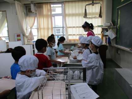 写真は1年生の給食当番の様子です。一生懸命がんばっていました。