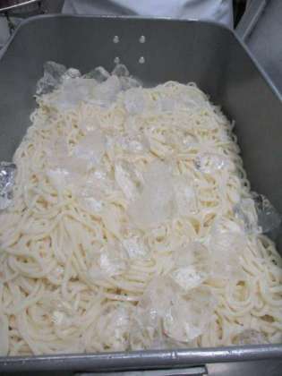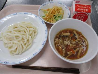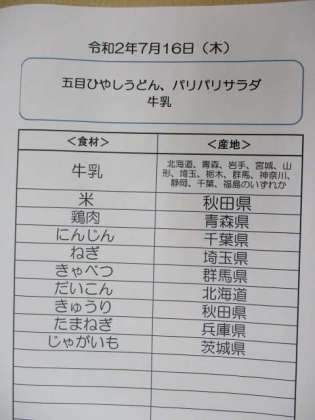 7月の暑い日にはのどごしのよい冷たいうどんがおいしく感じます。今日の給食でも、うどんをゆでた後、冷たい水でしめて「五目冷やしうどん」を作りました。教室に運ばれるうどんのバットには氷をいれました。