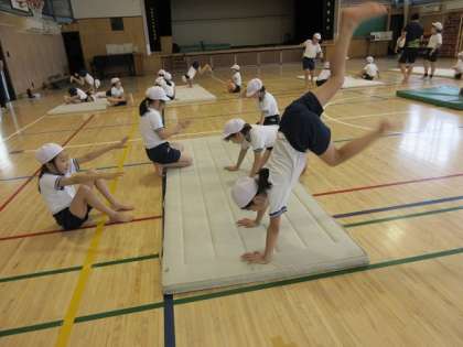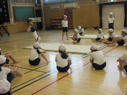 体育館では、4年生が「カエルの足打ち」という、マット遊びやマット運動の準備として行う、両手をしっかり広げて体重を乗せ、両足の裏を合わせる運動していました。