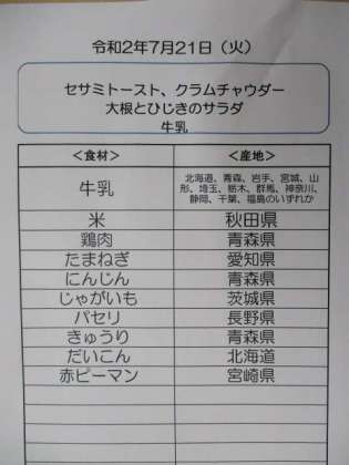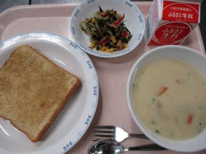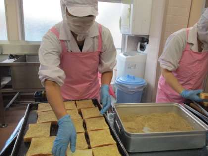 クラムチャウダーにはいっているあさりは不足しがちな鉄分を多くふくんでいる食べ物です。鉄分が不足すると、疲労感や頭痛をおこしてしまいます。鉄分はレバーや肉、大豆製品、海藻、緑黄色野菜に多くふくまれています。写真はセサミトーストをつくっているところです。
