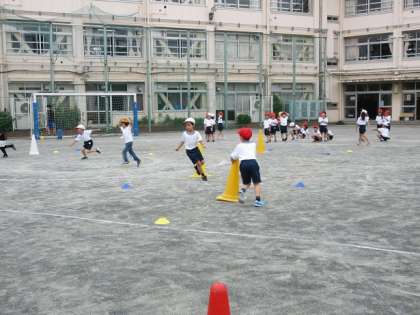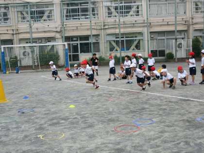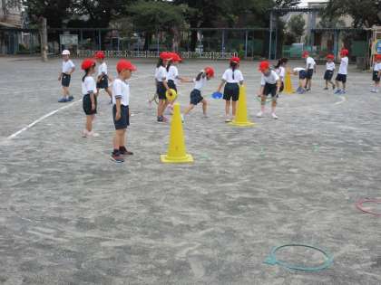 今日の1年生は、走るコースに、いろいろな障害物を置き、からだを上手にコントロールしながら走り抜けていました。また、走るだけでなく、自分たちでコースを考えて工夫していました。