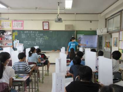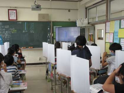 子ども達一人ひとりの考え方を学級全員で共有するために使っているのが、書画カメラと大型テレビです。カメラで写した子どもたちのノートをテレビに映します。映った画像を見たり、説明したりしながら学習を進めていきます。