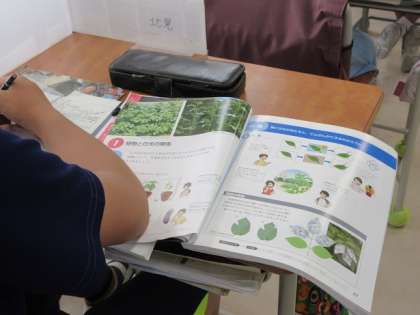 6年3組の理科の授業で、植物の水の通り道について、それぞれの考えた予想を発表していました。友達の意見に共感している様子がよくわかります。