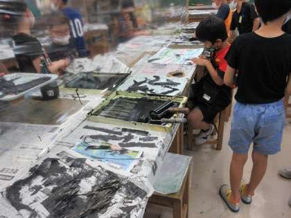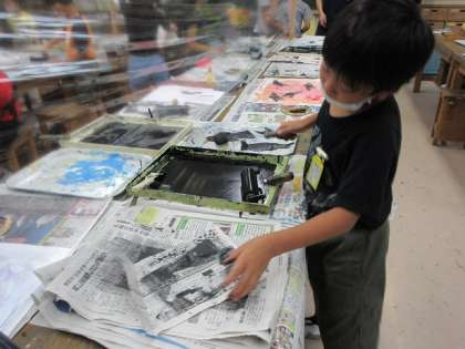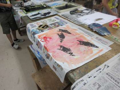紙版画をしていたようです。よく見ると、既に色を塗ってある紙の上に、魚の模様が浮かんでいました。