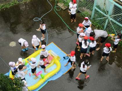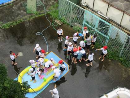 廊下を歩いていると、校舎の裏から、子どもの声が聞こえてきました。窓の下を覗いてみると、1年生が、家庭から持ってきた水鉄砲を使って水遊びをしていました。