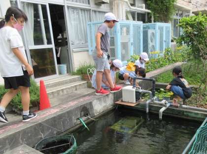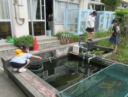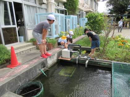 たくさんの子ども達が来るので、一人一人はわずかですが、コイやメダカにとってはたくさんもらえてうれしいのでは。
