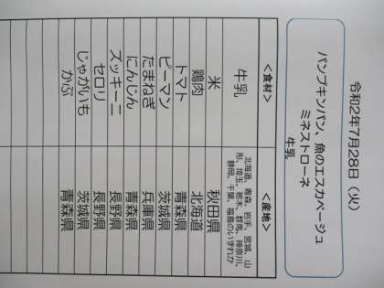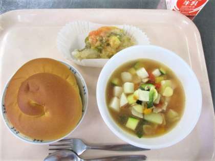 今日は夏野菜を使ったメニューです。魚のソースには新鮮な生のトマト、ミネストローネにはズッキーニが入っています。魚のソースは酢が入っていて、揚げた魚をさっぱりといただける夏にぴったりのメニューです。
