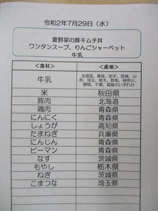 今日で1学期の給食は最後です。夏野菜を使った夏野菜の豚キムチ丼とワンタンスープです。辛さは控えめですが、キムチのうまみがきいたおいしいどんぶりができました。