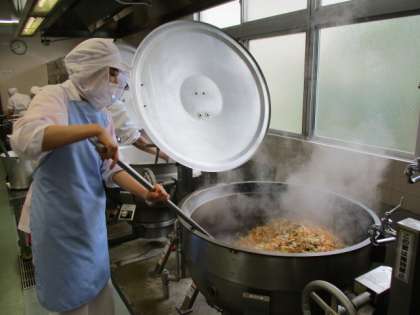写真は豚キムチ丼を大きな回転釜で炒めているところです。