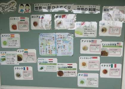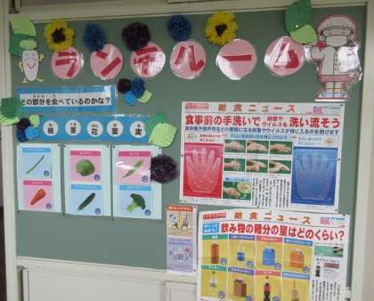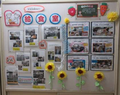 給食室の中の様子がわかるように、給食室前の廊下掲示を充実させました。ランチルームの掲示板も、給食のことがよく分かるように工夫されています。
