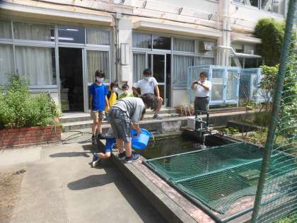 鯉やメダカの餌やりをしたり観察をしたりする子もいました。