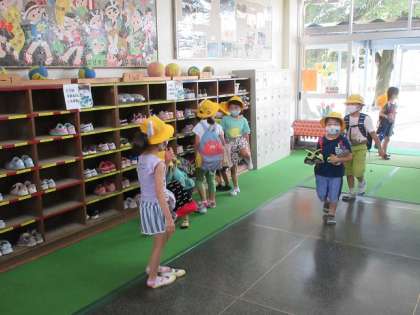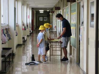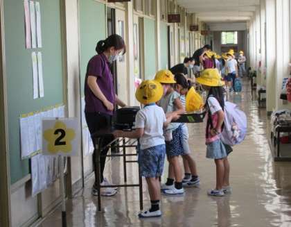 子ども達は普段通り、検温表を学年の先生の確認を受けてから教室へ、さらに手洗いへと向かいます。健康を守る習慣ができています。