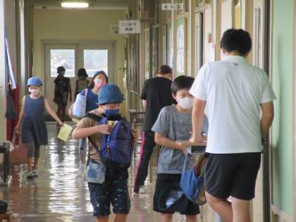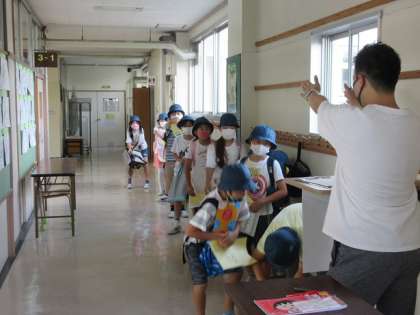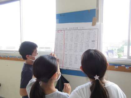3年生も早く教室へ入りたい気持ちが伝わってきます。4年生は、火によって参加児童の数が違うので、部屋割り表が掲示してありました。