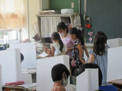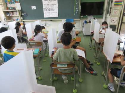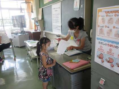 初日から1年生も、ドリルや夏休み帳をもってきて、しっかりと学習しています。