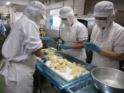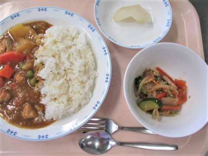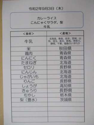 今日から給食が始まりました。2学期も給食室で力を合わせて栄養バランスのとれた、おいしい給食を作っていきます!楽しみにしていてください。デザートは今が旬の梨です。みずみずしい豊水という品種です。皮つきの果物は給食室でひとつひとつ皮をむいて提供しています。