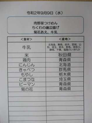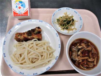 まだまだ暑い日が続きますね。今日は冷やしうどんなので、暑い日の給食にぴったりでした。冷水でしっかり冷やしたうどんに、氷をいれてクラスへ提供しています。