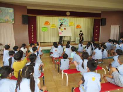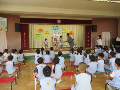 今日は8月生まれの皆さんの誕生会でした。年長組の誕生会の“お楽しみ”は、パネルシアターを使ったクイズでした。