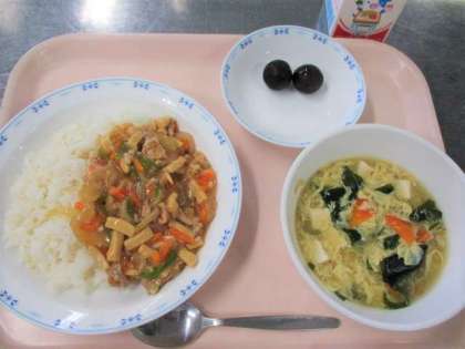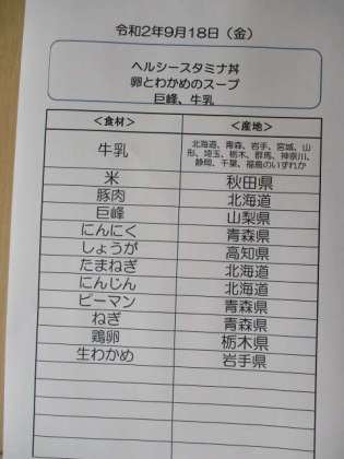 今日のデザートは秋が旬の巨峰です。ぶどうに含まれる果糖やブドウ糖は疲労回復効果が高いので疲れた時にはぶどうを食べましょう。スタミナ丼には高野豆腐を入れて、栄養とボリュームを増しています。