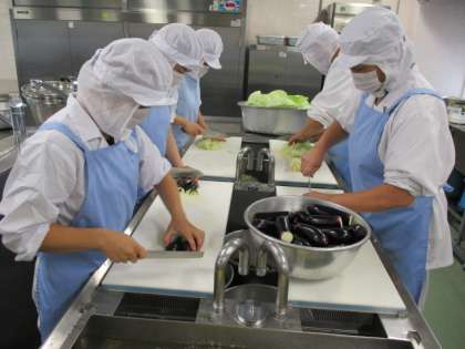 ナスは一度素揚げしています。じゃがいものハニーサラダは、はちみつを使ったドレッシングであえた野菜の上に、パリパリに揚げたじゃがいもをのせた料理です。とても子供達に人気のあるサラダです。写真は野菜を切っているところです。