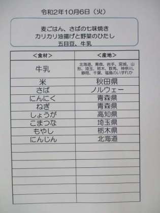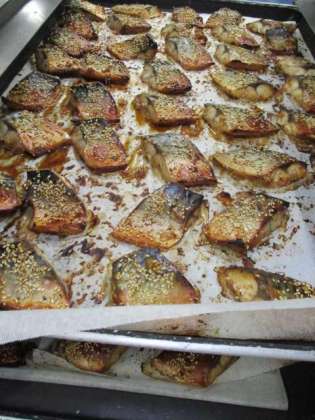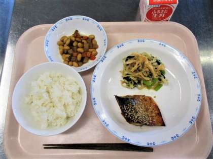 さばの七味焼きは、にんにく、ねぎ、しょうが、酒、七味唐辛子、しょうゆ、さとう、みりんを合わせたたれに2時間ほど付け込んでから白ごまを振って焼きました。香味野菜の香りがとてもよく、食欲をそそります。さばは秋から冬にかけてあぶらがのっておいしくなります。栄養があるので、魚の皮まで食べてほしいと思います。写真はさばの七味焼きが焼きあがったところです。