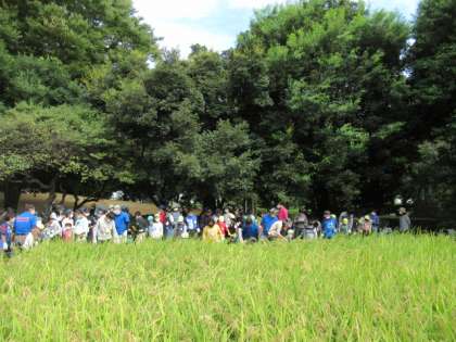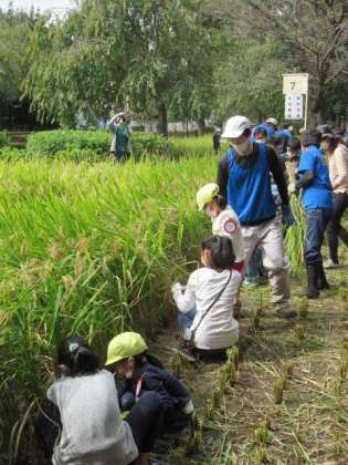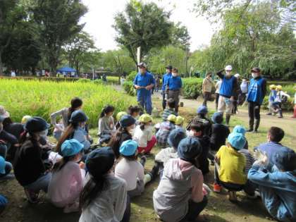 砧小学校5年生と稲刈りに行ってきました。5年生のお兄さんお姉さんは、カマの持ち方を直してくれたり、一緒に遊んでくれたりしました。いつも優しいお兄さんお姉さん、ありがとうございました。