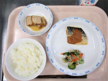 今日の主菜は焼いたさばの上にピリ辛ソースをかけたものです。ソースの材料は、すりおろしたにんにく、しょうが、白みそ、赤みそ、すりおろしたりんご、みりん、酢、酒、豆板醤、ごま油です。うまみのあるピリ辛ソースです。