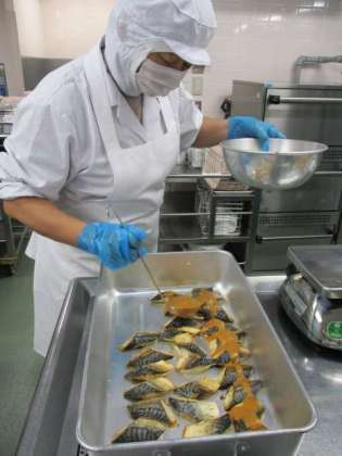 写真は焼きあがったサバの上にピリ辛ソースをかけているところです。