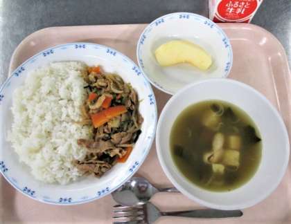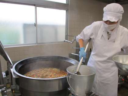 プルコギ丼は韓国の料理です。豚肉をしょうが、にんにく、しょうゆ、コチュジャン、砂糖、ごま油で作ったたれに漬けこんでから、たっぷりの野菜と一緒に炒めました。野菜はニンジン、玉ねぎ、もやし、にら、キャベツが入っています。写真はプルコギを配缶しているところです。