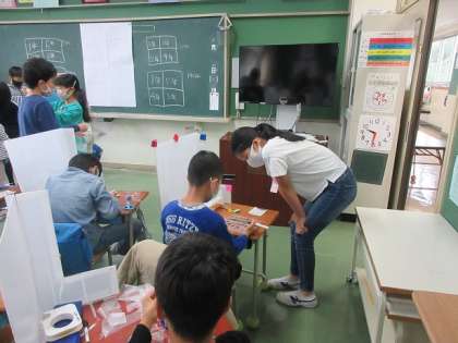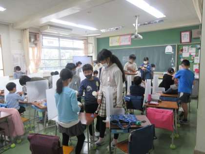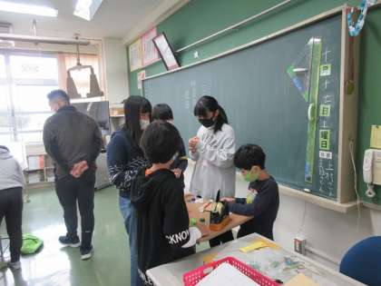 低学年のそばに寄り添いながら、おもちゃ作りをしました。