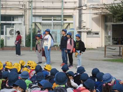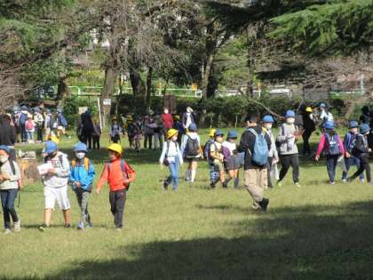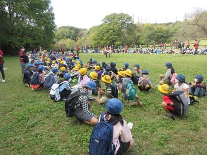 出発時には、代表委員の子供たちから、今日の遠足のめあてや目指すことの発表がありました。砧公園では、なかよし班での行動が基本です。前半は公園内でオリエンテーリングをやりました。