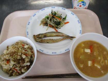 秋は炊き込みご飯が美味しいですね。今日は、鶏肉とごぼうがメインで、しょうゆ味がしっかり効いていて、食欲が倍増です。ししゃもはからりと揚がっており、歯ごたえが絶妙です。みそ汁には、豆腐やジャガイモ、ニンジン、油揚げと具だくさんで食べ応えがありました。