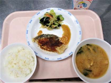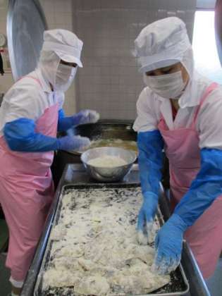 たらは漢字で魚へんに雪と書くように、冬が旬の魚です。今日は小麦粉をつけて油で揚げた後、すりおろし玉ねぎと調味料で作ったステーキソースをかけました。ステーキソースは玉ねぎの甘みがおいしいソースです。写真はたらを揚げているところです。