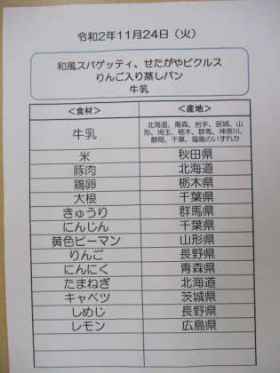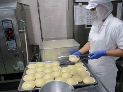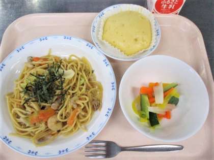 今日はしょうゆバター味の和風スパゲッティと、ピクルス、甘く煮たリンゴを入れた蒸しパンです。おいしい旬のりんごをレモン汁と砂糖で煮たあと、蒸しパン生地に入れて蒸しました。リンゴの香りとふわふわの食感がおいしい蒸しパンです。写真はりんご入り蒸しパンを配缶しているところです。