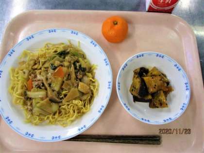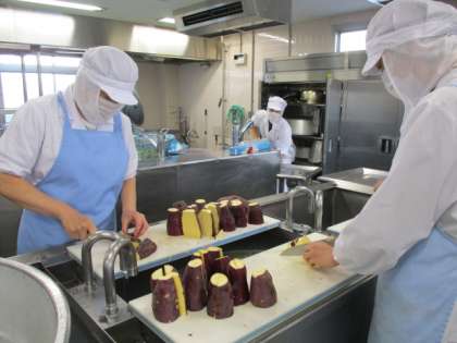 秋においしいさつまいもを使って、大学芋を作りました。大学芋はとても人気のある献立です。写真は大学芋に使うさつまいもを切っているところです。砧小全員の分で約40キロのさつまいもを切りました。