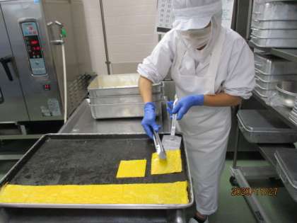 今日と明日は砧小の展覧会です。給食では、展覧会献立として「おえかきオムライス」を作りました。オムライスの卵はオーブンで薄く焼いて作っています。薄焼き卵の上にケチャップで好きな絵をかいて楽しめる献立です。肉団子スープの肉団子は一人4,5個食べられるように、約2200個作りました。写真は薄焼き卵を配缶しているところです。きれいな黄色い卵焼きができました。