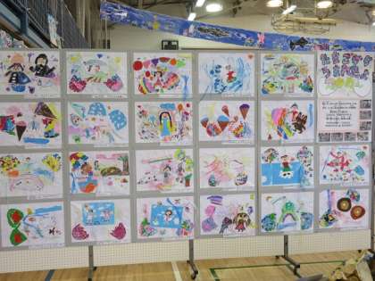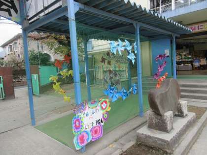 正門を這入ってすぐの渡り廊下に展示された大きな風車、「ようこそ」の文字が読み取れたでしょうか。1年生の共同作品です。