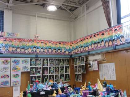 2年生のコーナで上を見上げると、子ども達の顔でいっぱいの「にじいろタペストリー」が目に入ります。一人一人の顔がにこにこしています。