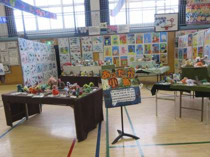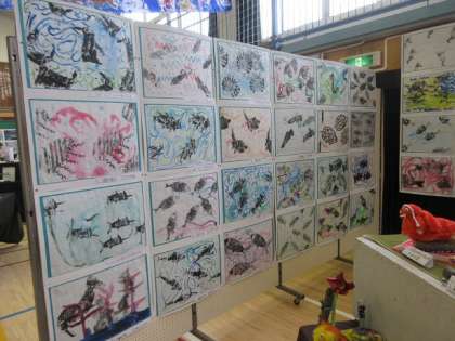 平面作品は「アボリジニアート」と「ふしぎな花」です。茶色の台紙に独特の色使いとデザインで描かれた絵には、異文化体験を感じる「アボリジニアート」です。不思議な花は子ども達の想像力に溢れた作品です。