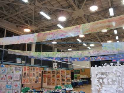 上にかかっているタペストリーですが、真ん中あたりに来ると、色が濃い青色に代わります。4年生共同作品「古代の海」は、よく見ると化石のような絵や古代魚が描かれています。