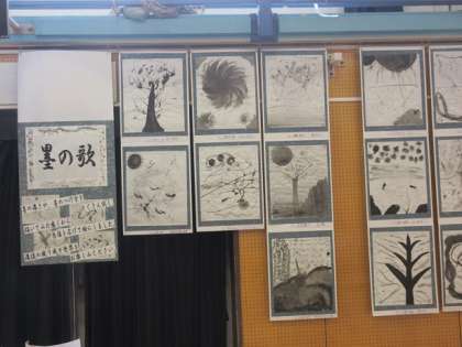 平面作品は「名画とコラボ」と「墨の歌」です。名画を自分の作品の中に取り込み、そこから作品を仕上げてきました。名画の雰囲気がよく出ています。作成中から見ていた「墨の歌」です。どんな作品なるだろうと期待していました。白と黒の作品ですが、6年生らしい落ち着いた感じです。