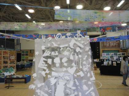 会場に入るとまず目に入るのが、ビニルと発泡スチロールで作られた6年生の共同作品「白の世界」です。白から子どもたちはどんなことをイメージしたのでしょうか。