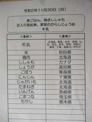 今日は11月最後の給食です。来月もこどもたちのために安全でおいしく、栄養満点の給食を作っていきますので、どうぞよろしくお願いいたします。