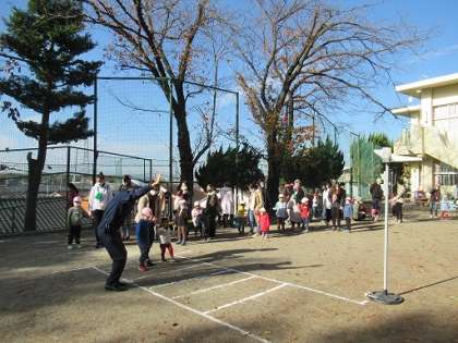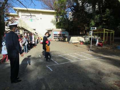 成城警察の方から、交通安全についてご指導いただきました。年少組さんは、親子で横断歩道の渡り方や歩き方を確認しました。